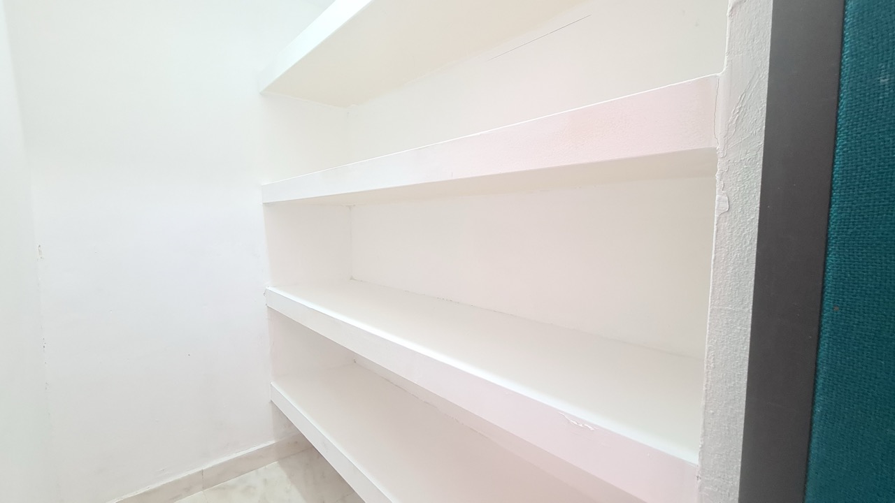 Incluye un baño con espacio de almacenamiento para útiles de limpieza.